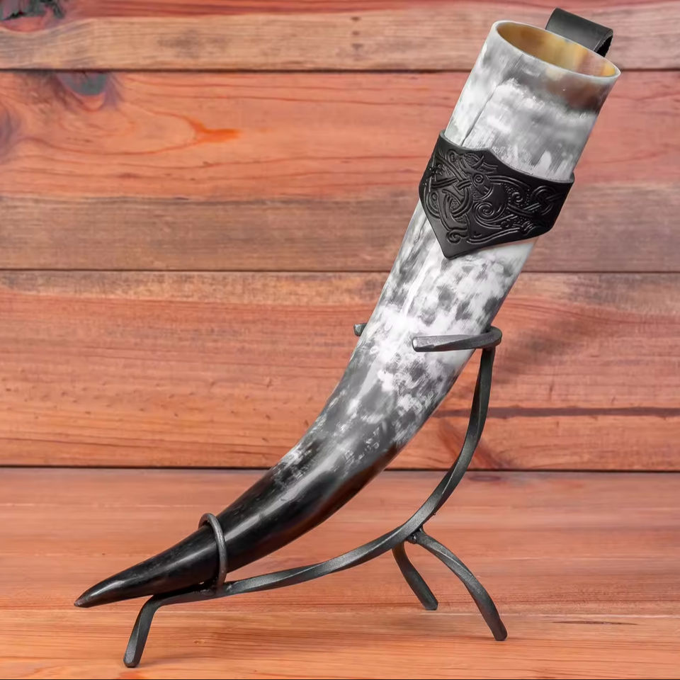 Cuerno de beber vikingo artesanal natural hecho a mano soporte de cuero de buey de vaca pulido con soporte de Metal para decoración de celebración de Navidad
