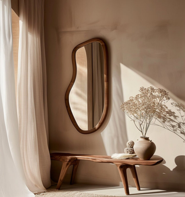 Espejo de Pared Ovalado de Madera Natural Hecho a Mano, Ecológico, Ligero, Diseño Abstracto Único, Estilo Art Deco para Entrada