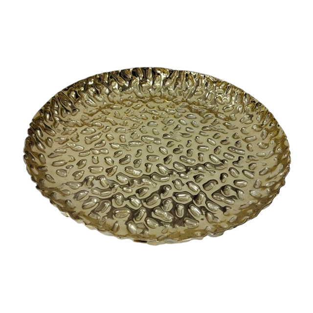 Recién llegado hecho a mano, plato redondo dorado, plato de servicio martillado desigual para mesa, utensilios de cocina, decoración de vajilla