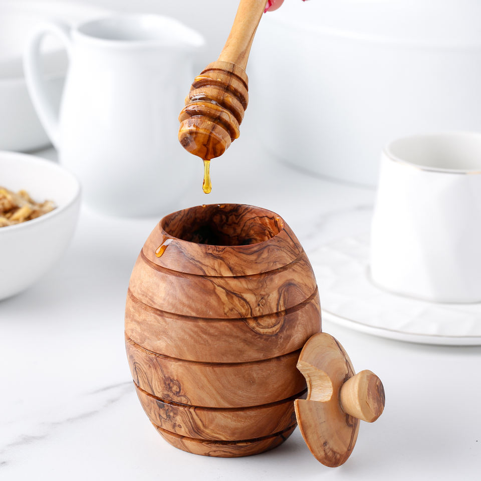 Tarro de Miel Artesanal de Madera de Olivo con Cuchara de Madera, Tarro de Miel Ecológico, Juego de Vajilla de Madera de Olivo de Alta Calidad