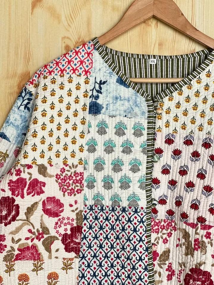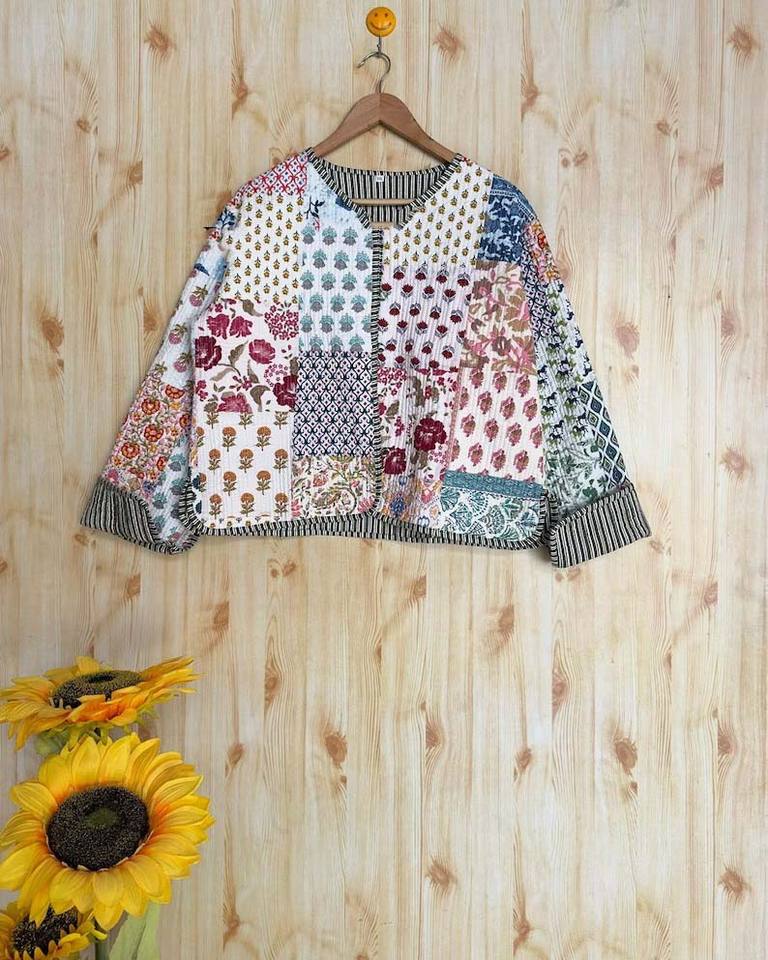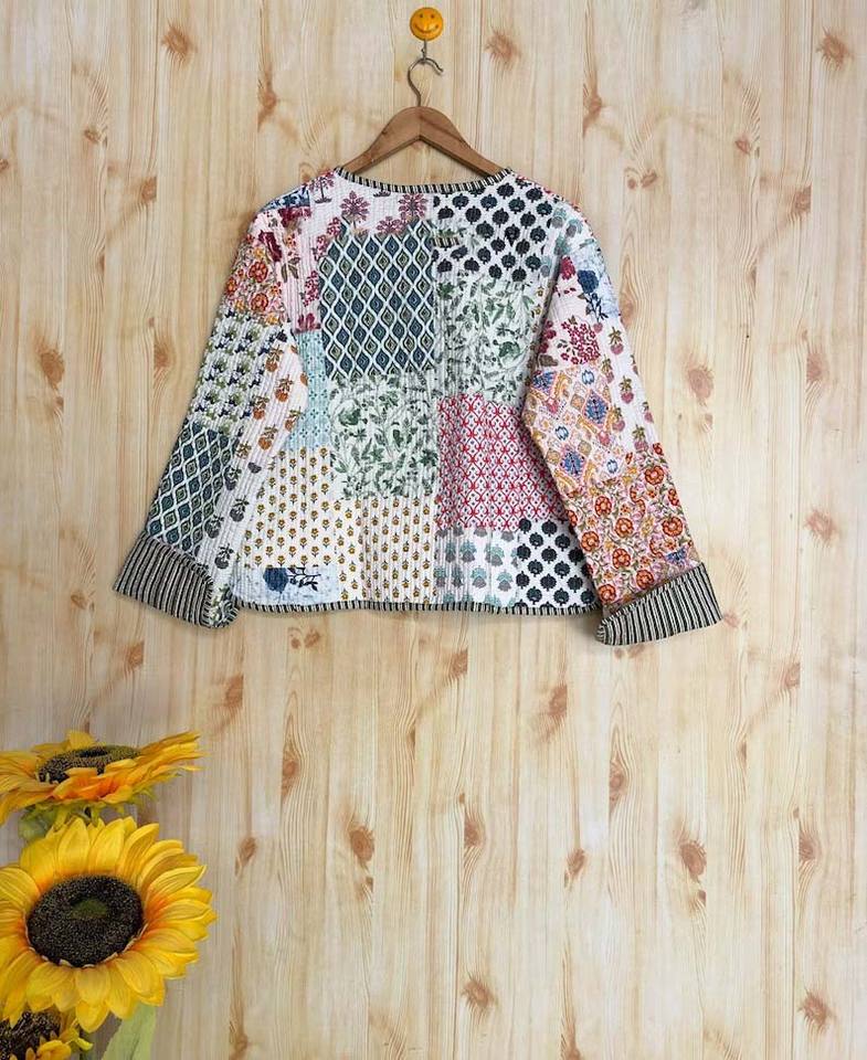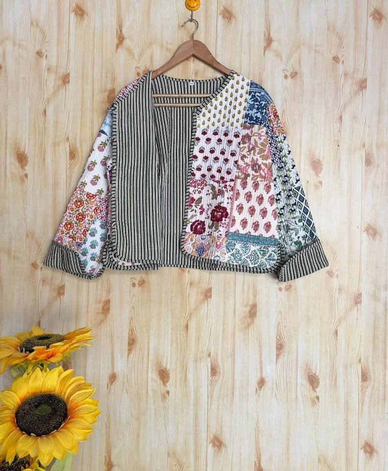 Chaqueta corta transpirable hecha a mano unisex de algodón Sari Kantha con diseño de retazos cosido a mano por el artista