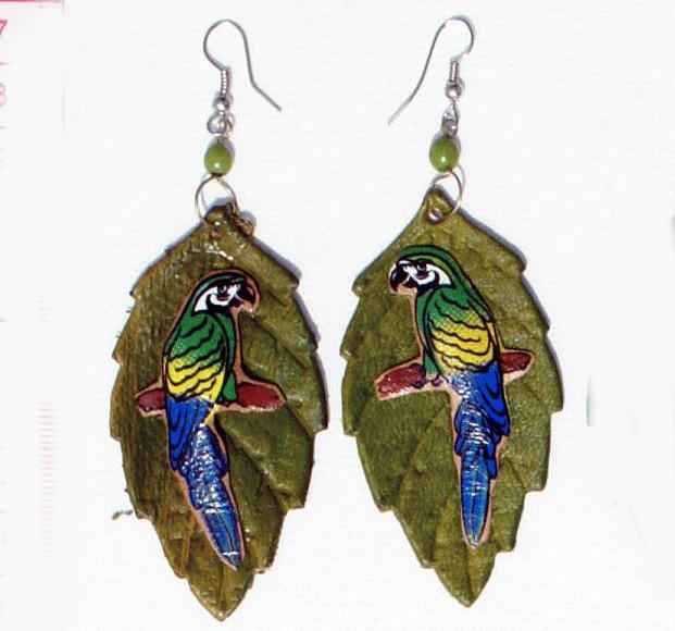 Pendientes colgantes de moda peruana hechos a mano hoja verde con joyería artesanal de Arte de loro colorido