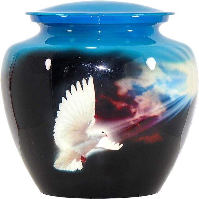 Urna Funeraria Artesanal con Diseño de Paloma para Cenizas Humanas, Urna Conmemorativa para Cremación, 10X5 pulgadas, Negro y Azul Cielo