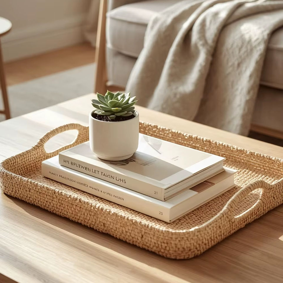 Bandeja de Servir de Ratán Premium Hecha a Mano con Asa de Madera Sólida, Mimbre Natural Ecológico para Té, Café, Comedor, Diseño Rústico
