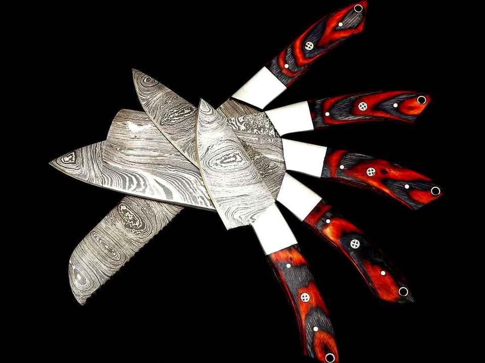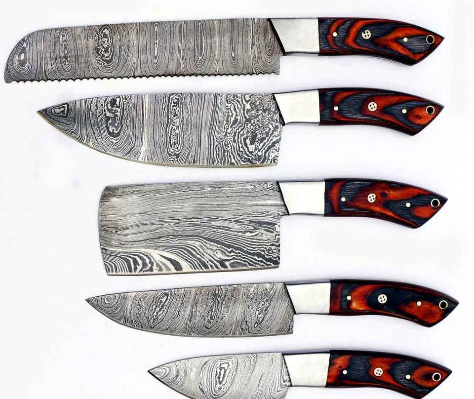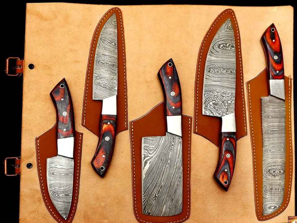 Juego de Cuchillos de Cocina Profesionales Hechos a Mano, 5 Piezas, con Metal de Damasco y Mango de Madera Pakka Roja, KS-EI-06