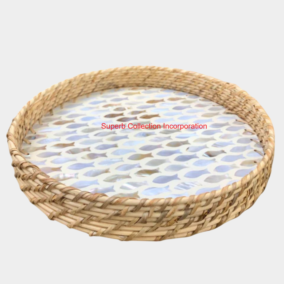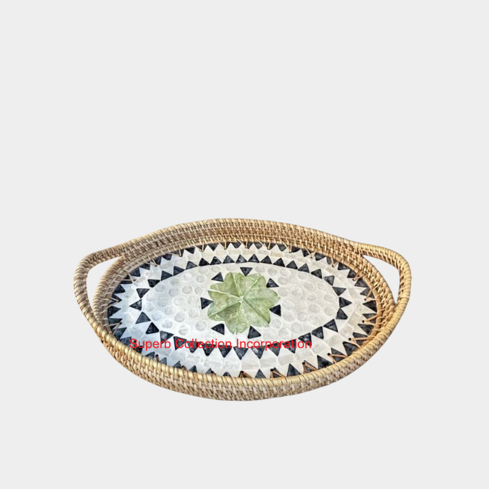 Bandeja redonda de ratán hecha a mano con incrustaciones de hojas de madreperla, mesa de centro decorativa elegante y bandeja otomana para decoración del hogar