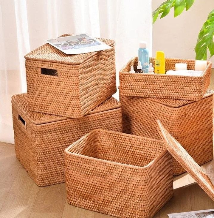 Cesta de Almacenamiento de Ratán Hecha a Mano con Asas, Organizador Rectangular Tejido Ecológico, Precio Económico
