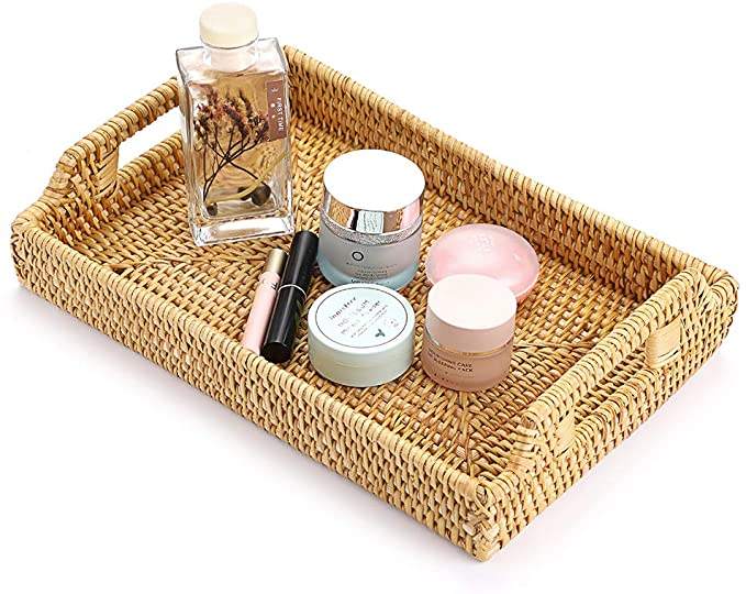 Juego de 2 Bandejas para servir de ratán rectangulares hechas a mano con asa, perfectas para cocina y hogar, suministros al por mayor