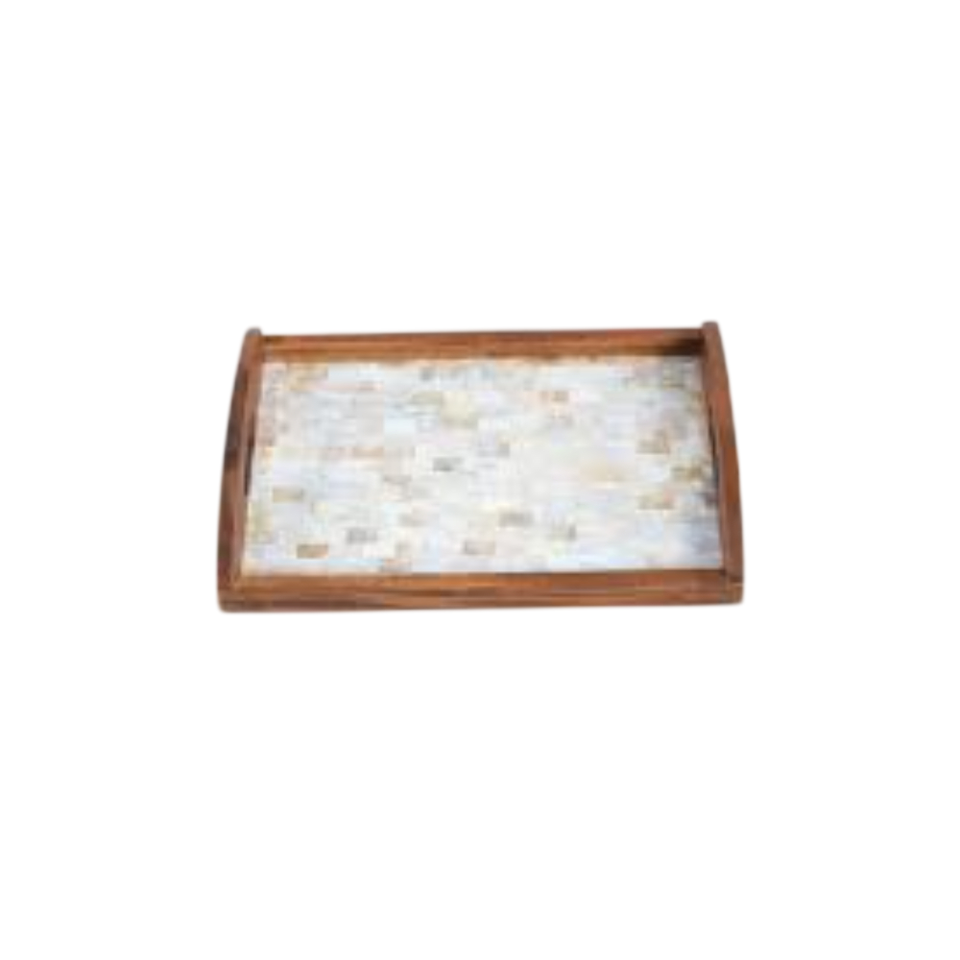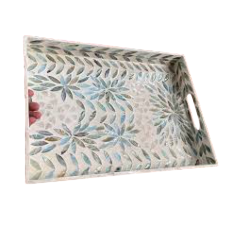 Bandeja de servir rectangular hecha a mano con incrustaciones de nácar y asas, bandeja de desayuno para mesa de café con diseño floral azul.