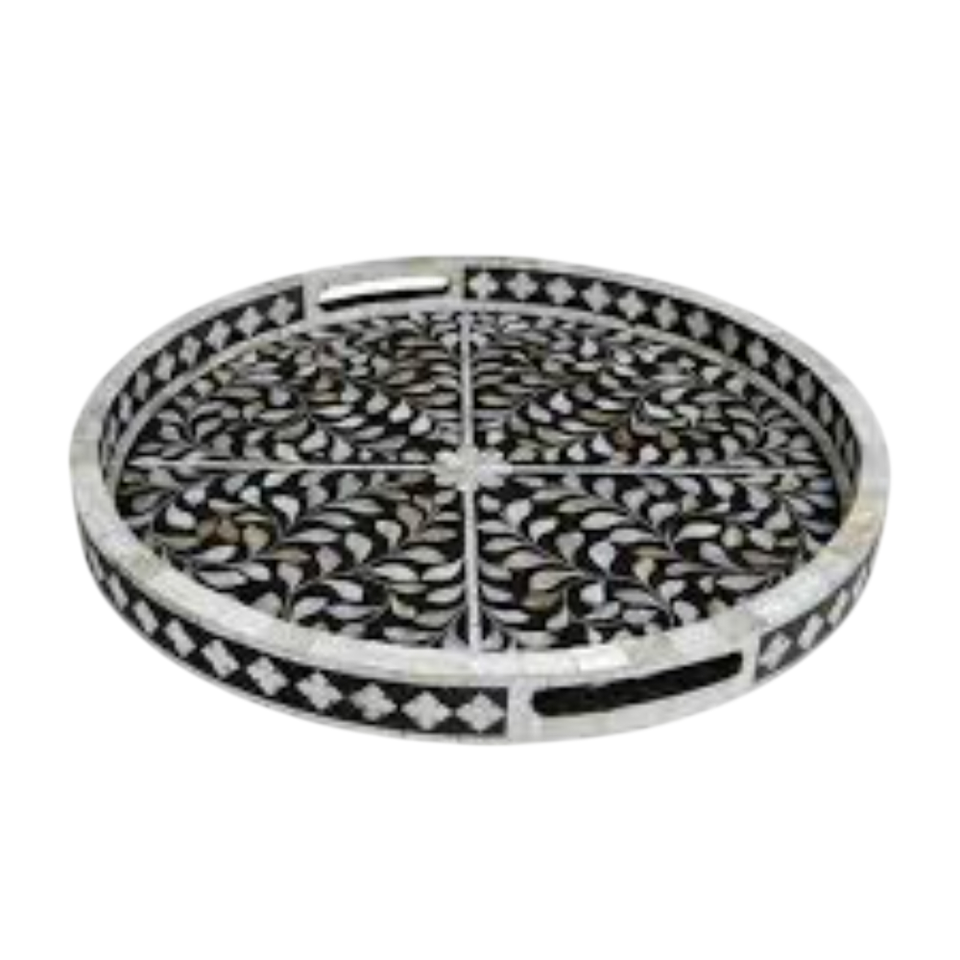 Bandeja de servir rectangular hecha a mano con incrustaciones de nácar y asas, bandeja de desayuno para mesa de café con diseño floral azul.