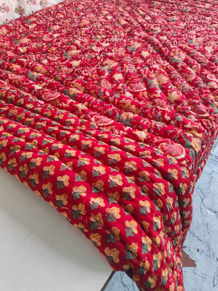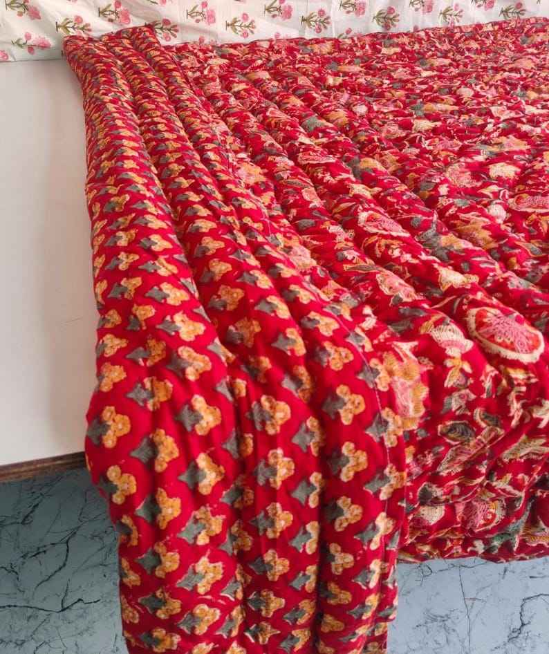 Manta Dohar Jaipuri Reversible con Estampado Floral Rojo, Hecha a Mano con Algodón