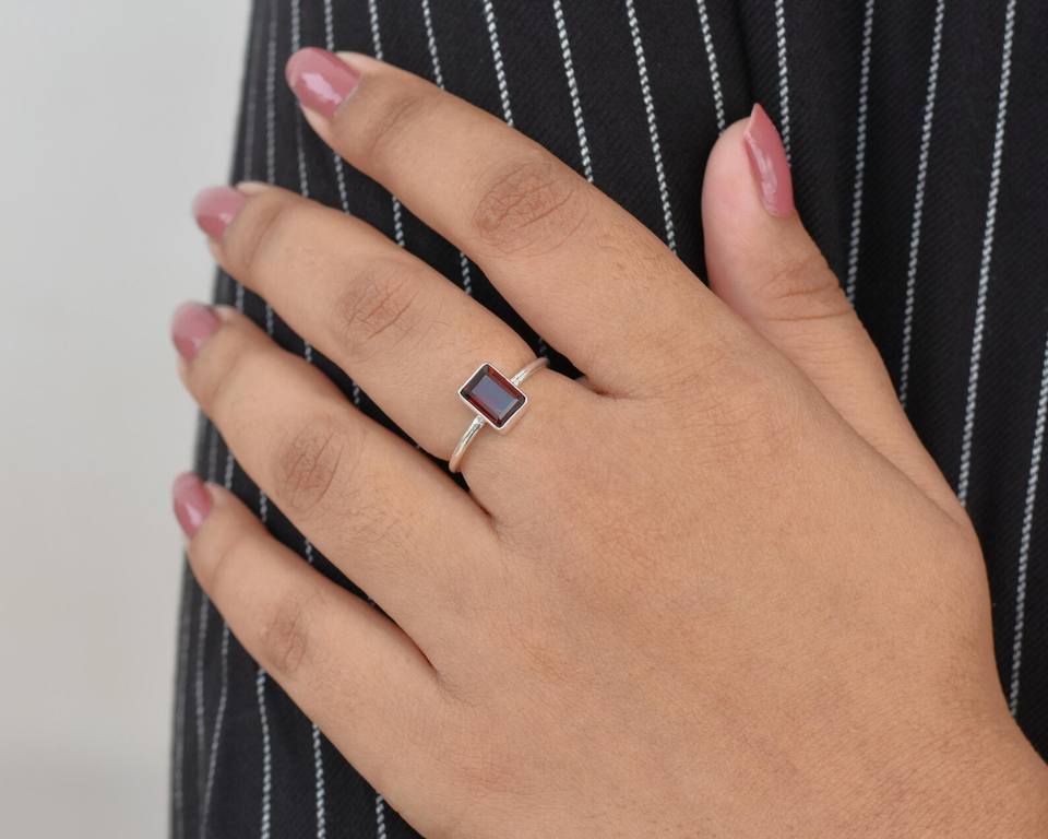 Anillo de bisel de Octágono granate rojo hecho a mano 6x8mm joyería de plata de piedras preciosas naturales anillo artesanal único regalo para mujeres