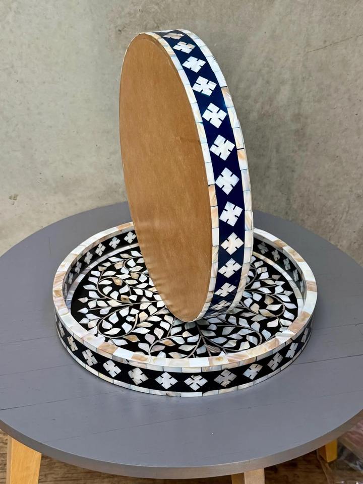 Bandeja de servicio decorativa grande ecológica redonda hecha a mano, incrustaciones de perlas madre florales modernas para decoración de Diwali de boda de lujo para el hogar