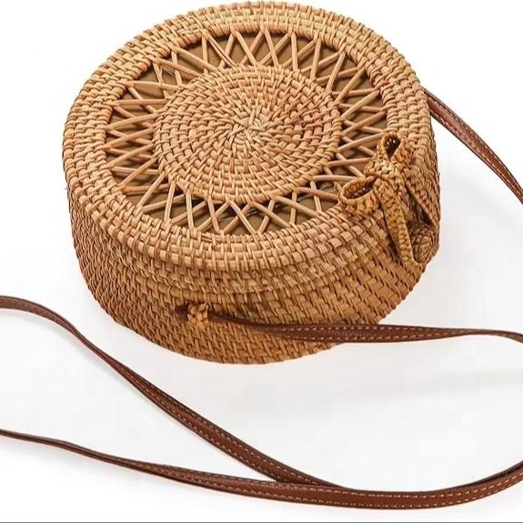 Bolso Redondo de Ratán Hecho a Mano con Correa de Cuero | Bolso de Playa Cruzado Tejido de Verano para Mujer, Bolso de Hombro de Moda