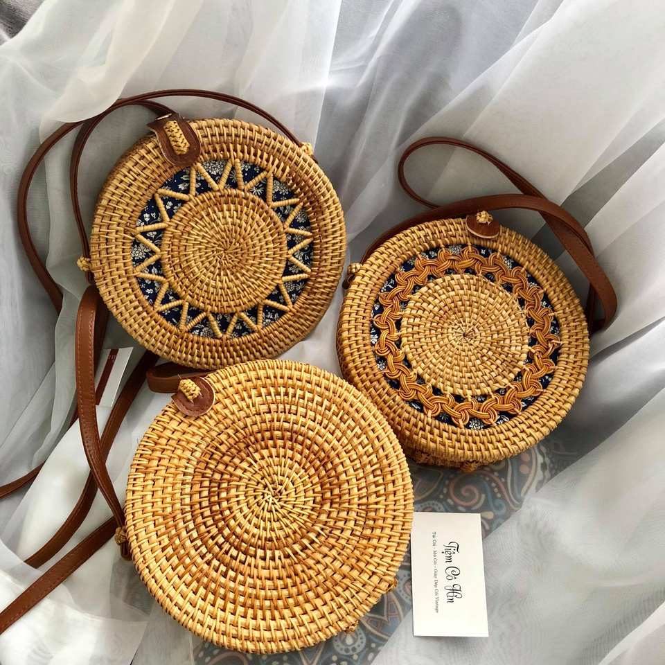 Bolso Redondo de Ratán Hecho a Mano con Asa de Cuero, Bolso de Playa Tejido Natural, Fabricante de Vietnam, Venta al Por Mayor
