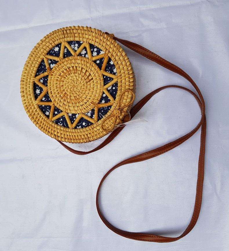 Bolso Bandolera Redondo de Ratán Hecho a Mano con Diseño de Mandala Impreso, Dos Correas de Perlas, Moda de Primavera Verano para Mujer
