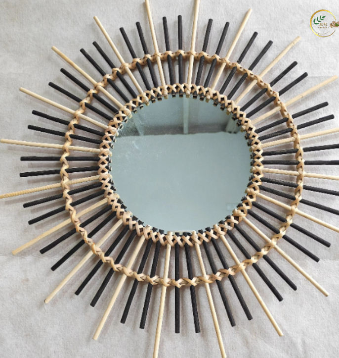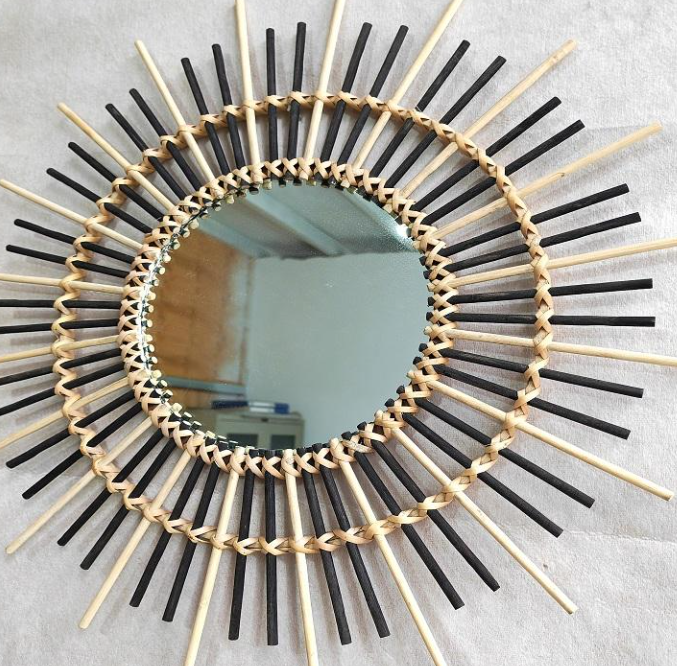 Espejo de ratán redondo hecho a mano con diseño Art Deco Estante de pared de paja tejida vertical para decoración de aniversario