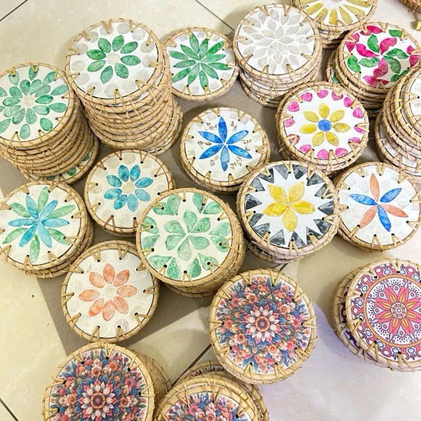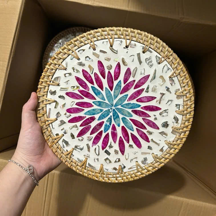 Salvamanteles Redondo de Ratán Hecho a Mano con Mosaico de Madreperla Floral, Material Natural, Venta Directa de Fábrica, Logotipo Personalizado, Vietnam