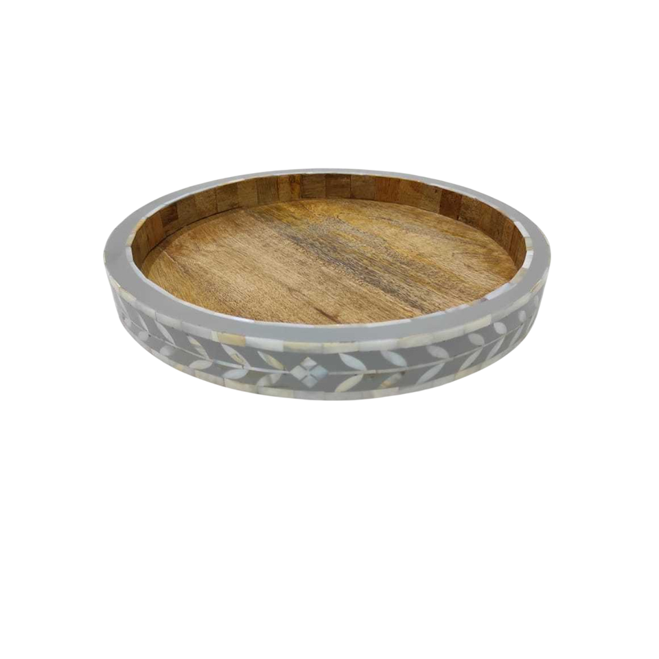 Bandeja Redonda de Ratán Hecha a Mano con Incrustaciones de Madreperla Azul, Estilo Boho, Bandeja Decorativa con Base Incrustada para Mesa de Centro