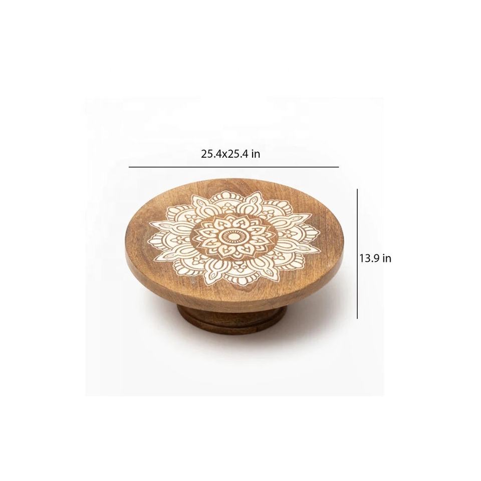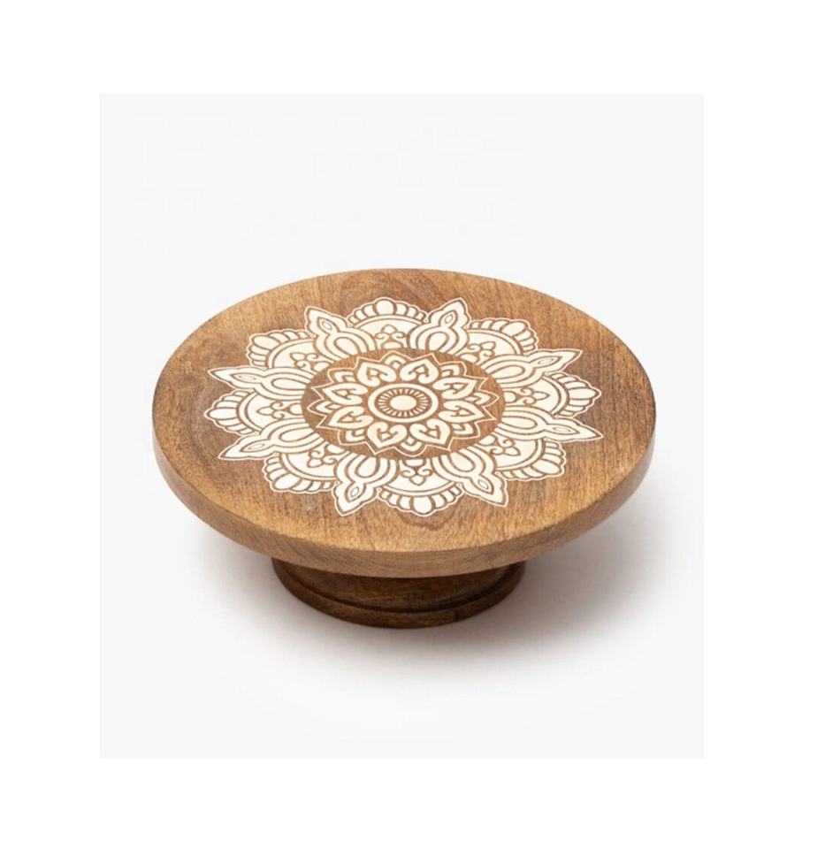 Hecho a mano redondo de madera maciza diseño impreso Mango Acacia Royal Cakes soporte Fabricante Mayorista pastel soporte hogar y decoración