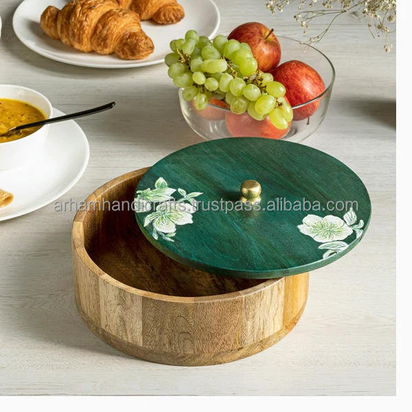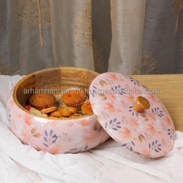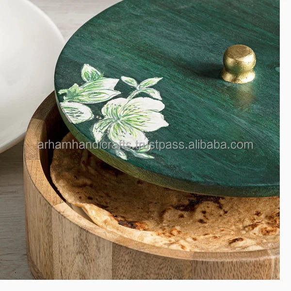 Caja de Chapati y roti redonda de madera hecha a mano con estampado de letras Floral Chapati Box Cazuela para Roti Brown Precio bajo de LUXURY CRAFTS