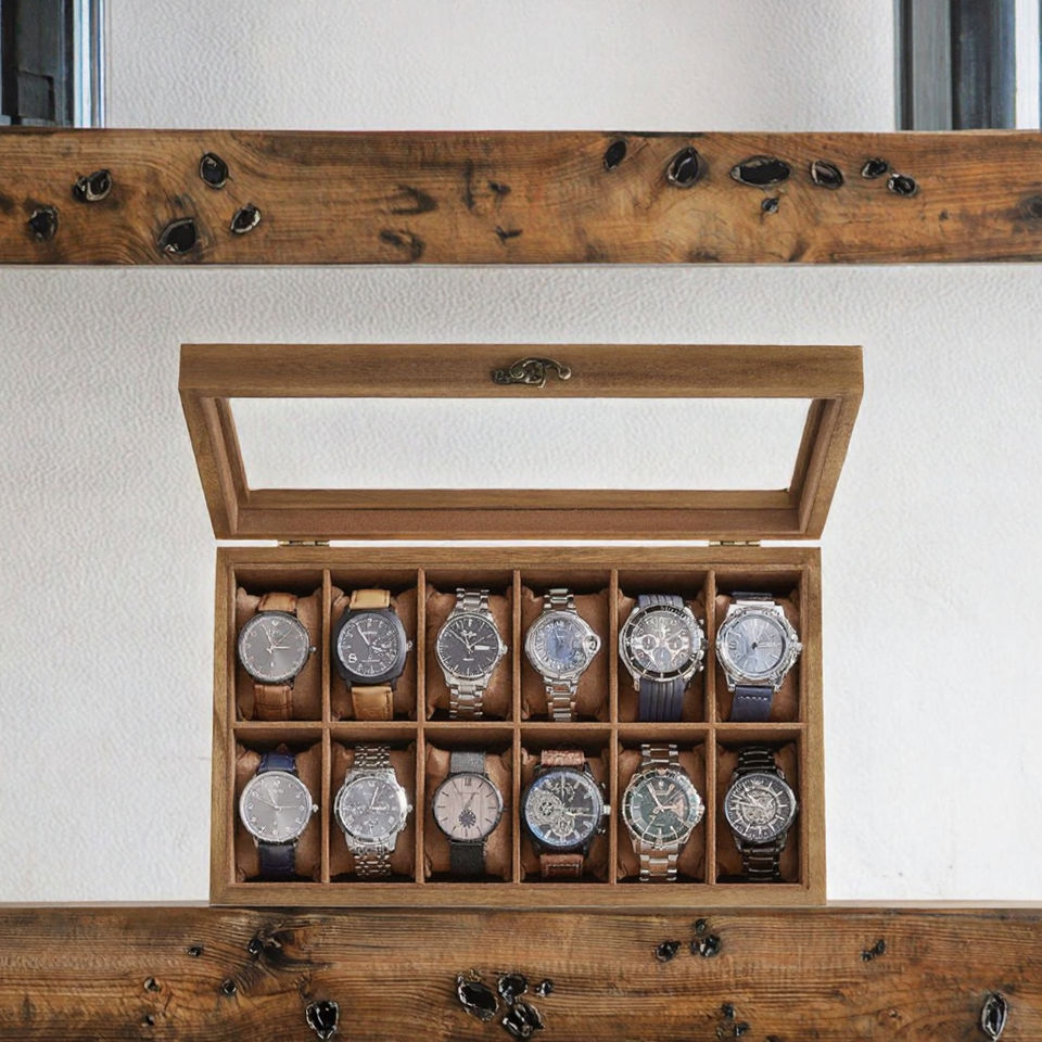 Caja de reloj de madera maciza rústica hecha a mano con 10 ranuras, organizador de caja de reloj con tapa de vidrio de Global Exports