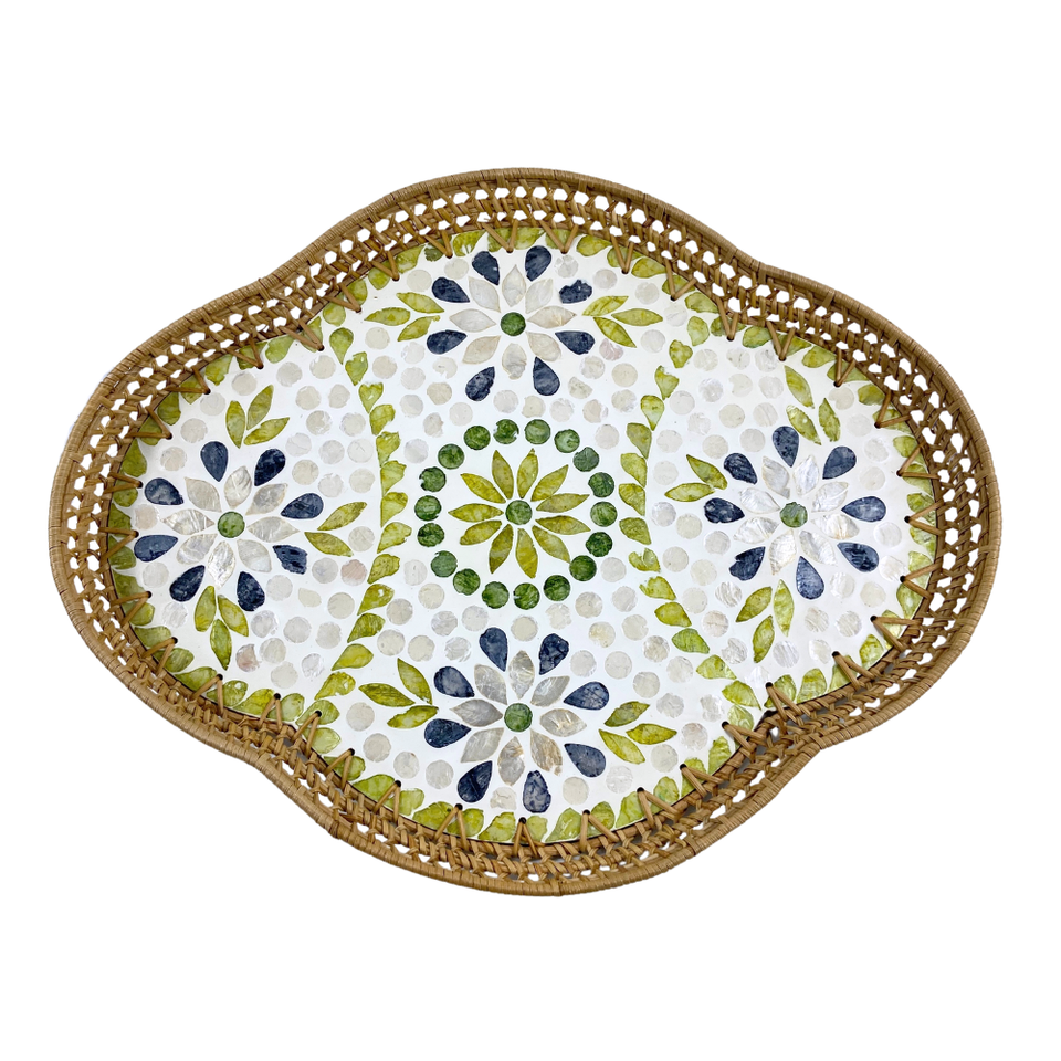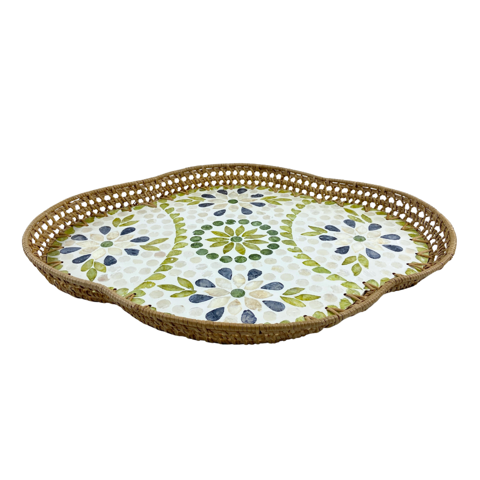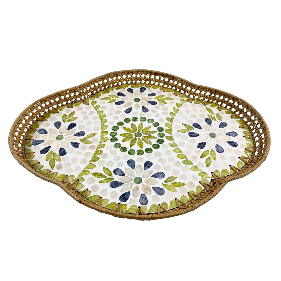 Bandeja de Ratán Festoneada Hecha a Mano con Incrustaciones Florales de MDF y Capiz, Diseño de Mosaico, Bandeja Decorativa para Servir en el Hogar