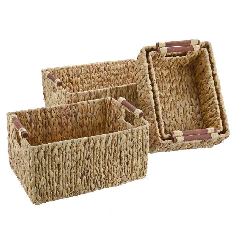 Juego de 4 cestas de almacenamiento de jacinto de agua hechas a mano, asas de madera para uso en la cocina, tela tejida, material de hierro/metal para almacenamiento de alimentos
