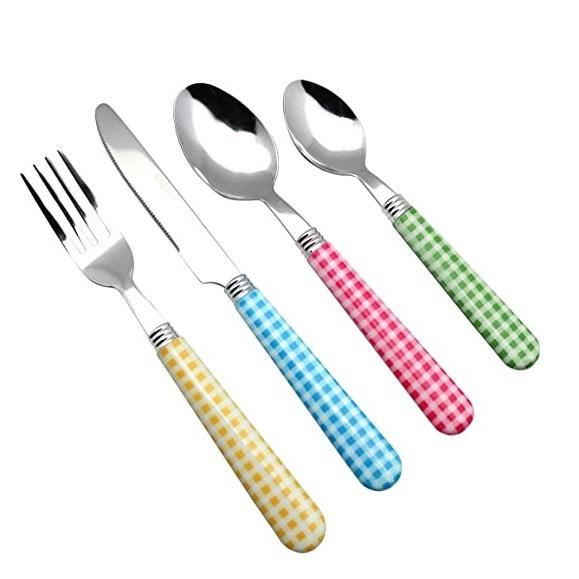 Juego de cubiertos pulidos brillantes hechos a mano con mangos de esmalte impreso multicolor que incluye cuchillo, cuchara, tenedor, esparcidor