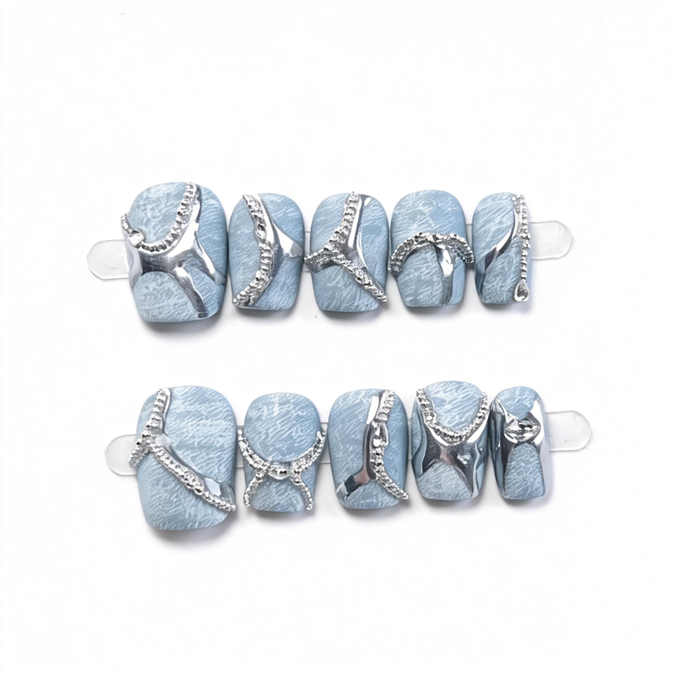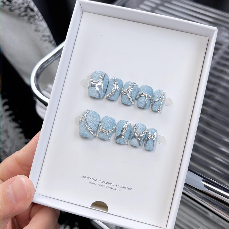 Uñas Postizas Cortas Cuadradas Hechas a Mano con Textura Vaquera Mate, Cristales Marquise y Línea Metálica Plateada, Uñas Estilo Y2K al por Mayor