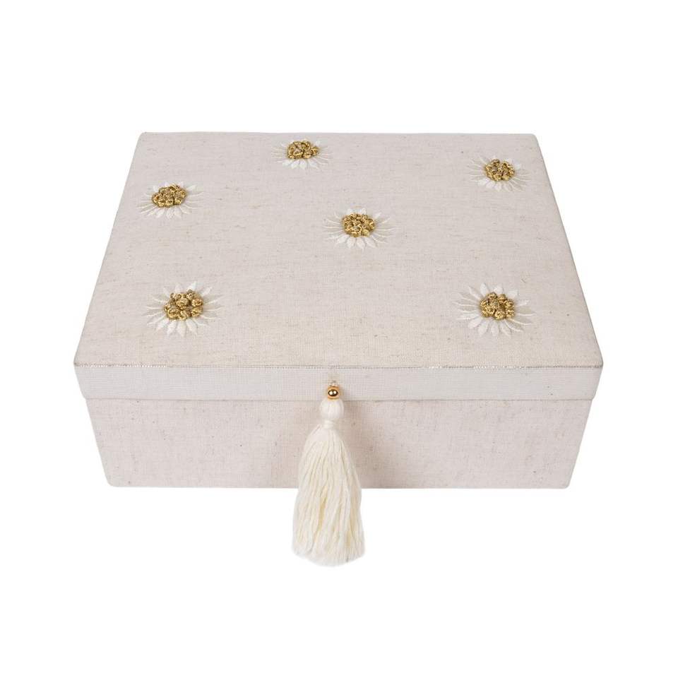 Caja de Anillos Cuadrada Hecha a Mano con Bordado de Hortensias, Estuche de Joyería de Tela con Borla de Cuentas, Diseño Moderno, Artesanía