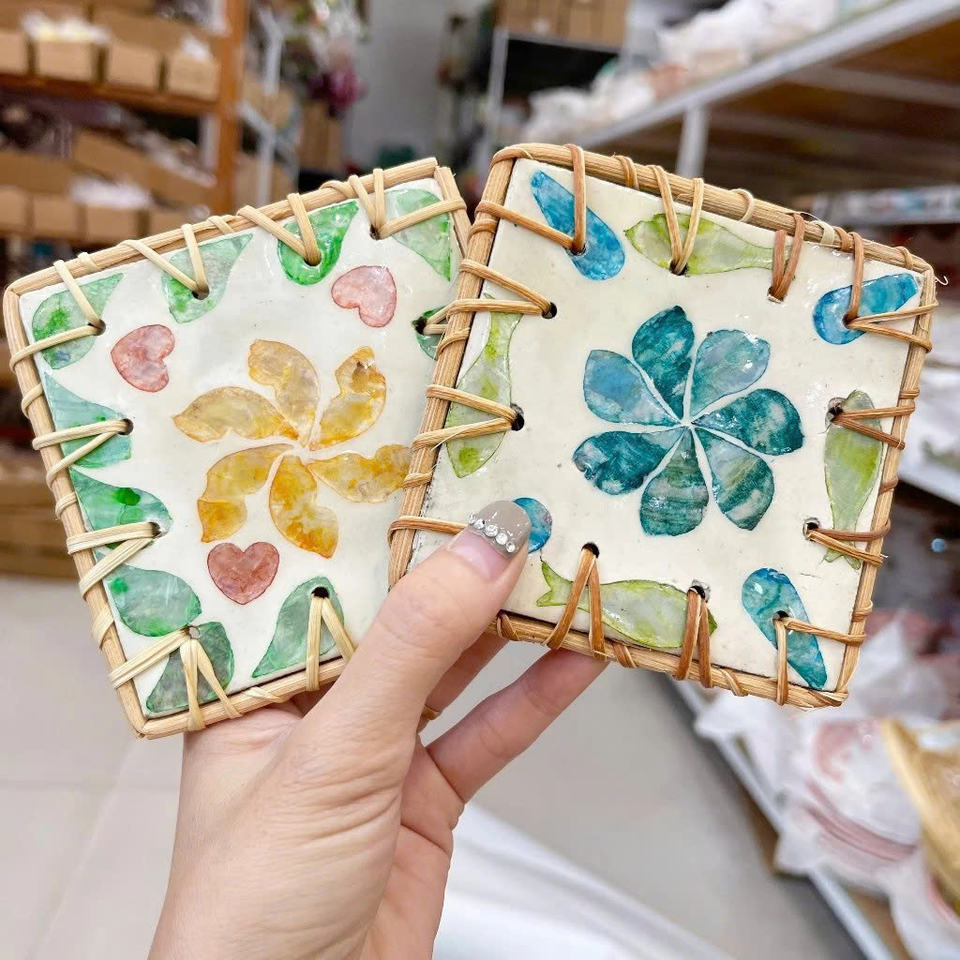 Salvamanteles Cuadrado de Ratán Hecho a Mano con Mosaico Floral de Madreperla, Venta al por Mayor Directa de Fábrica, Logotipo Personalizado, Decoración de Mesa Vietnamita