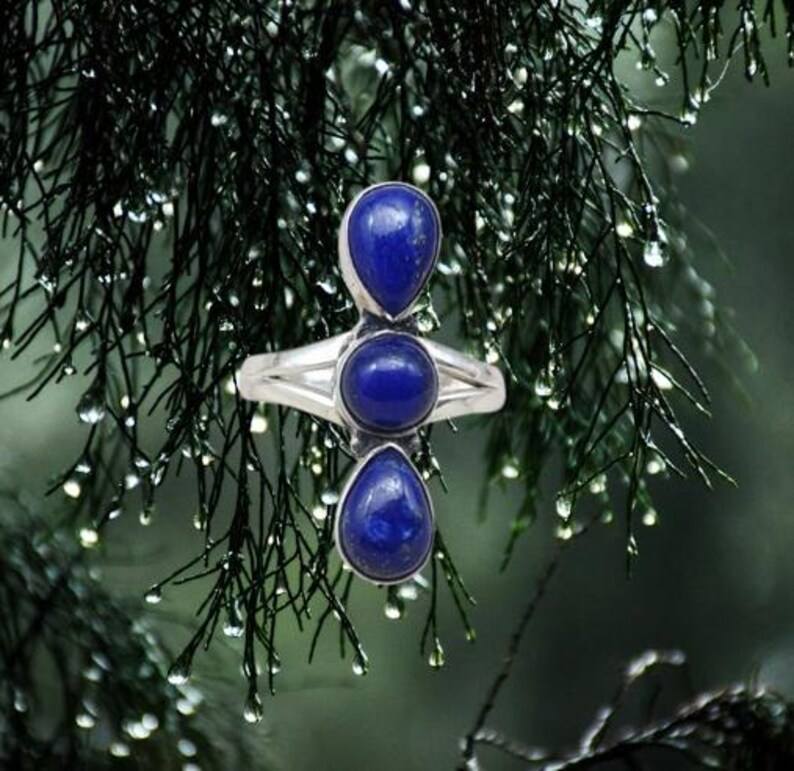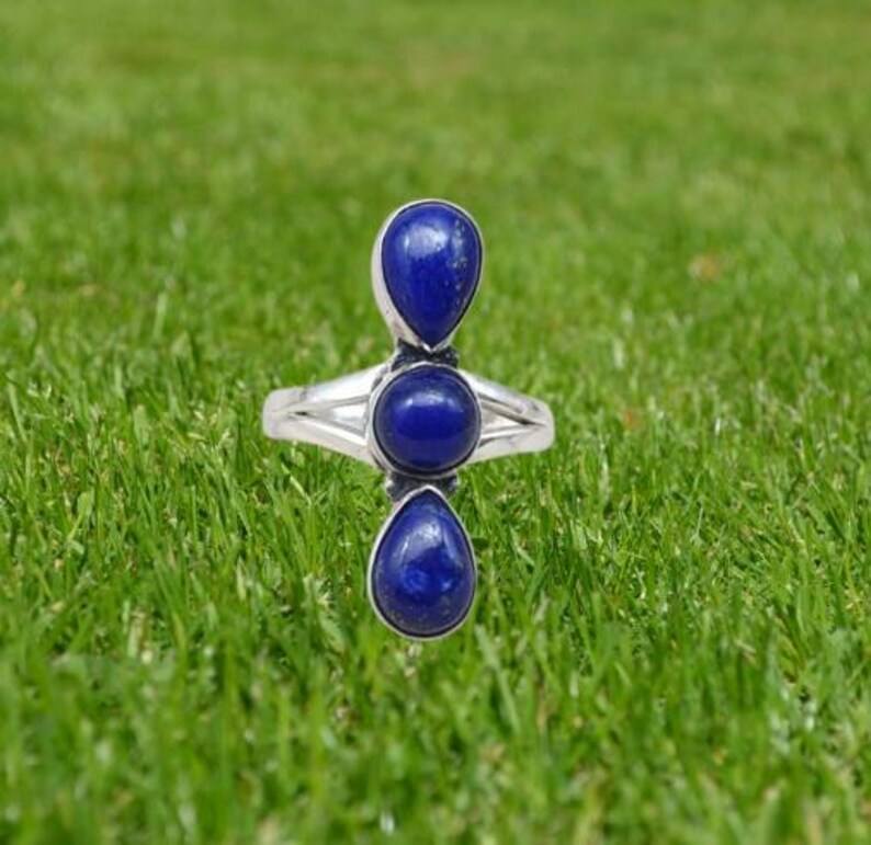 Anillo de lapislázuli de plata esterlina hecho a mano, lágrima redonda, piedra preciosa Bohemia, joyería artesanal para mujer