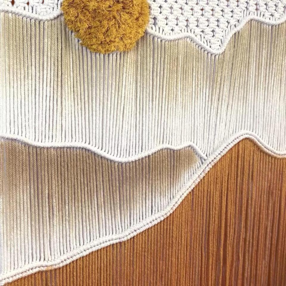 Tapiz de macramé hecho a mano con diseño de atardecer para fondo fotográfico, ideal para fotografía estética y creación de contenido.