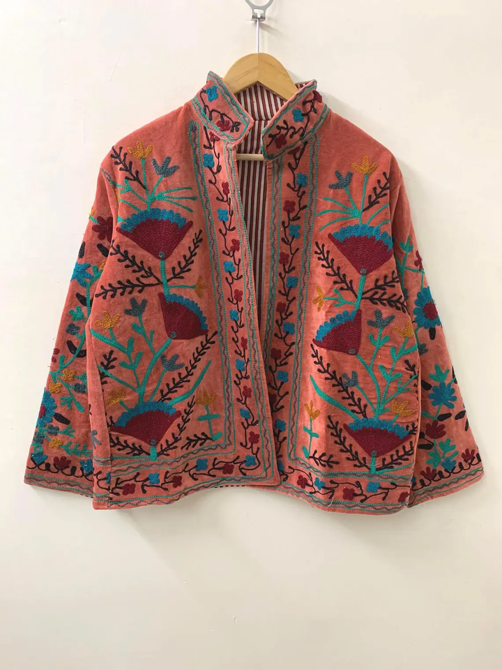 Chaqueta de Terciopelo Bordada Suzani Hecha a Mano, Abrigo Boho Vintage, Chaqueta Unisex de Invierno, Ropa Exterior Étnica Chic