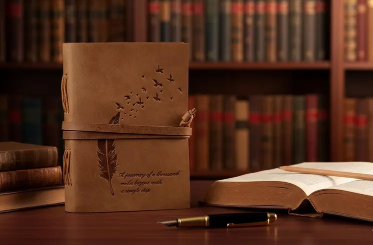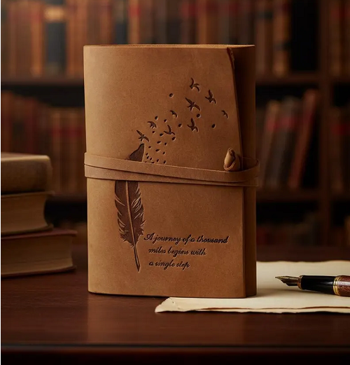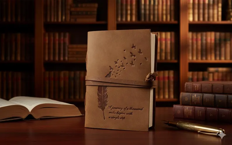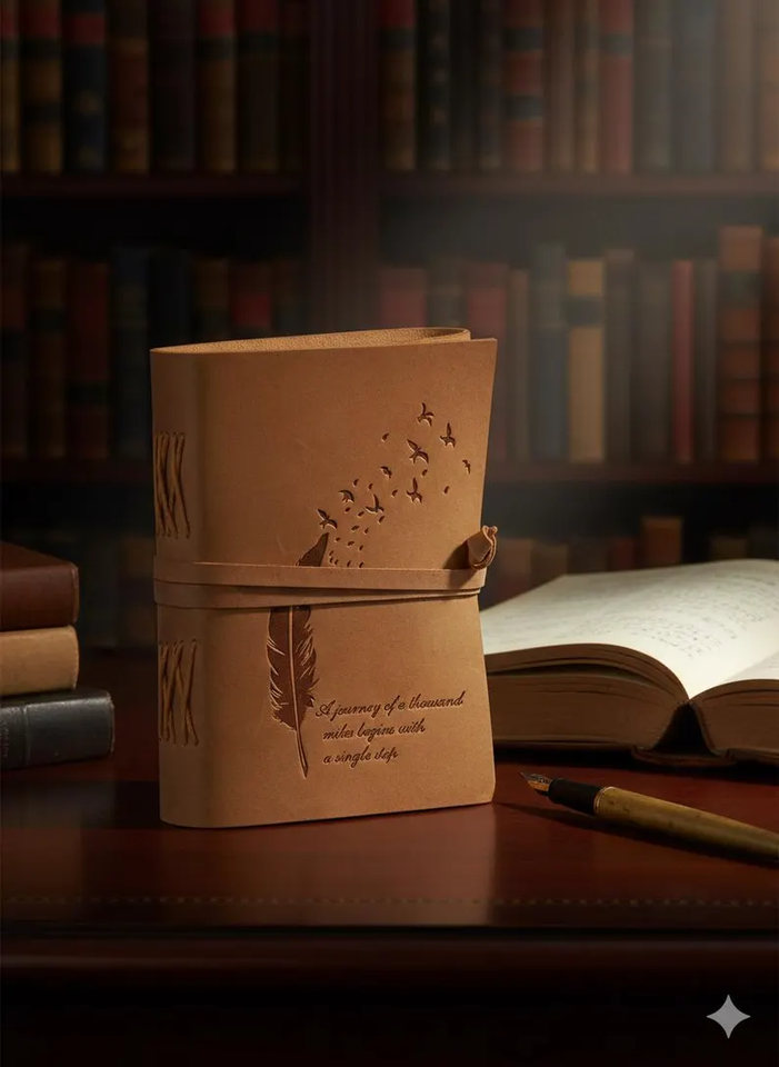 Cuaderno de Cuero Tostado Hecho a Mano con Borde Rústico y Grabado de Plumas, Diario Vintage Rústico