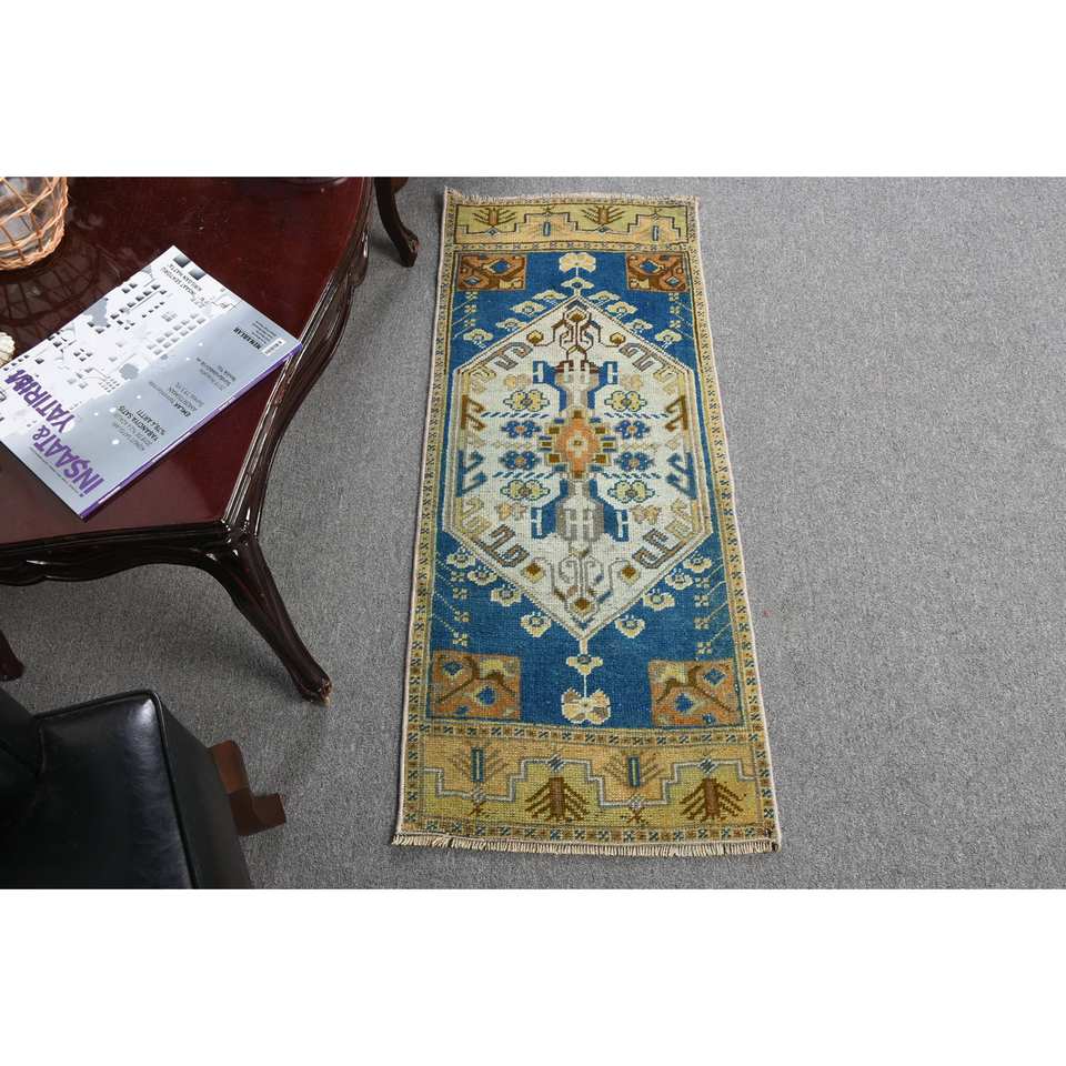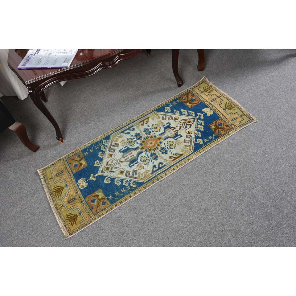 Alfombra de lana de retazos azul y amarillo tradicional hecha a mano, alfombra turca hecha a mano de 1,6x3,8 pies para sala de estar, pasillo rectangular, cabecera de látex