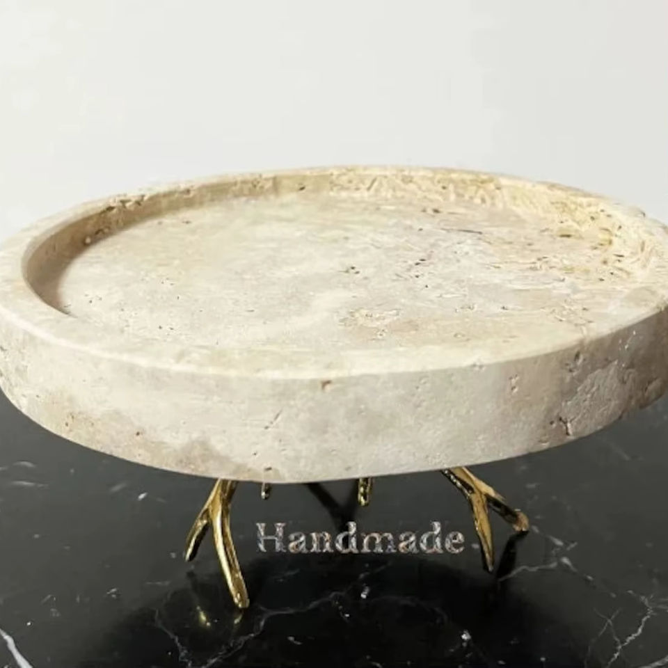 Base Redonda para Pastel de Piedra Travertino Hecha a Mano con Elegantes Patas de Rama Dorada, Base de Exhibición de Lujo para Cocina y Decoración de Mesa