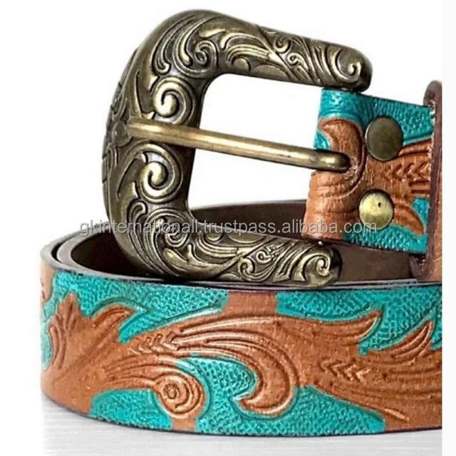 Cinturón de herramientas de cuero occidental grabado de Color turquesa hecho a mano para hombres y mujeres con hebilla de Pin Floral Chapado en latón Vintage