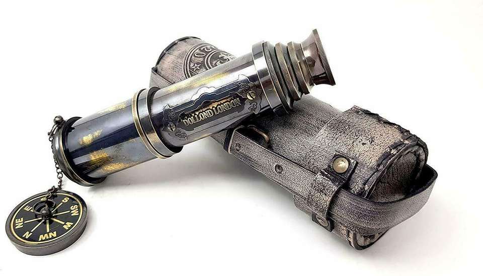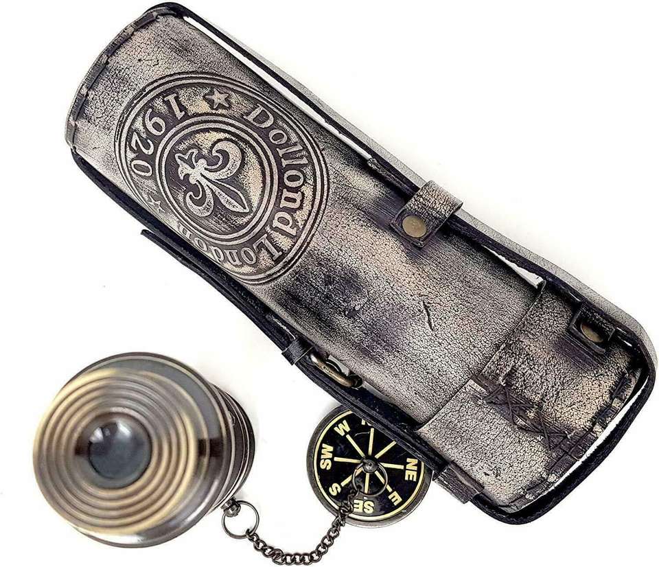 Brújula Telescópica Victoriana Hecha a Mano de Latón Grabado de 18 Pulgadas con Funda de Cuero, Herramienta de Navegación Marítima Antigua