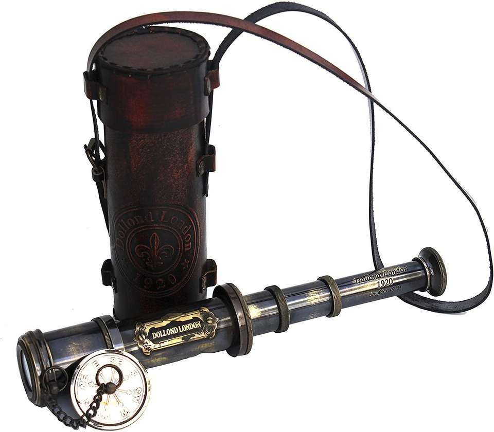 Telescopio de latón vintage hecho a mano con estuche de cuero, catalejo marítimo náutico para uso en piratas marinos y senderismo y exteriores