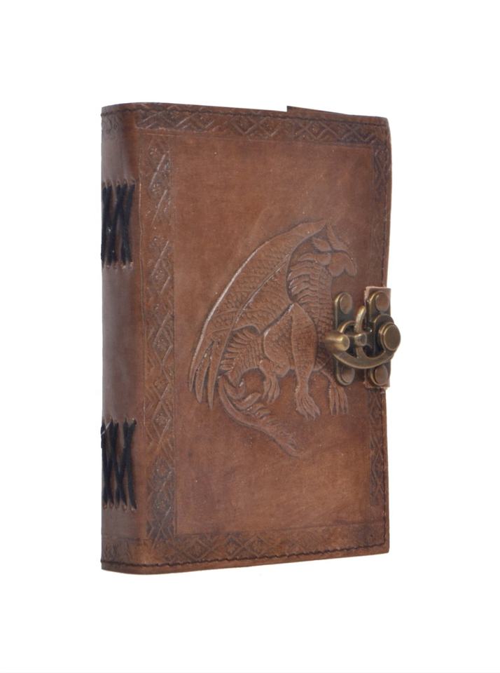 Cuaderno de diario en relieve de dragón de cuero genuino Vintage hecho a mano, planificador diario, página en blanco con cerradura C de latón antiguo