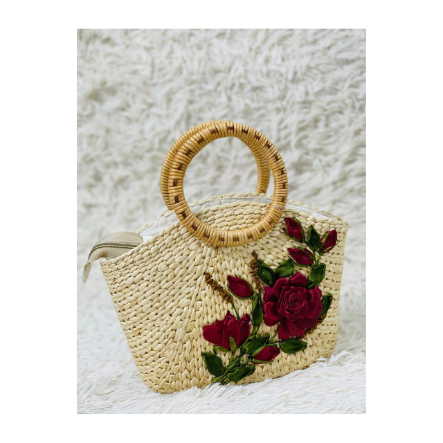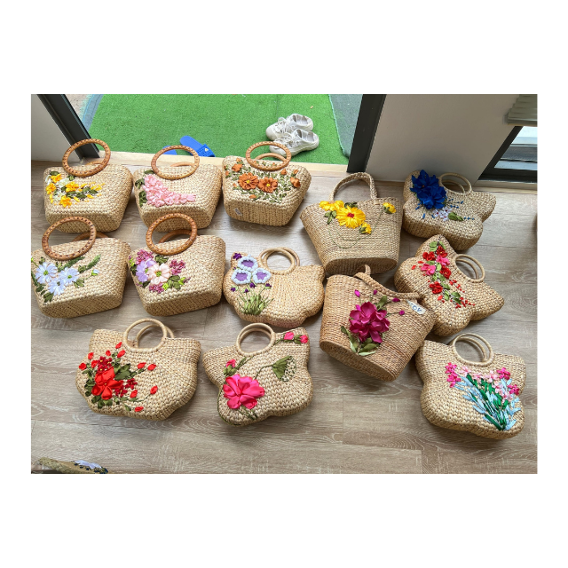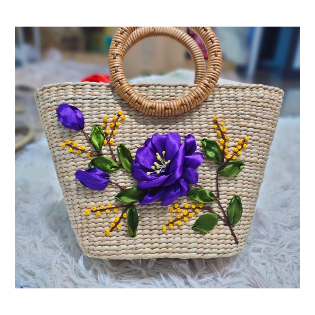 Bolso de jacinto de agua hecho a mano con diseño de flores bordadas, bolso de mano de paja de playa de Vietnam