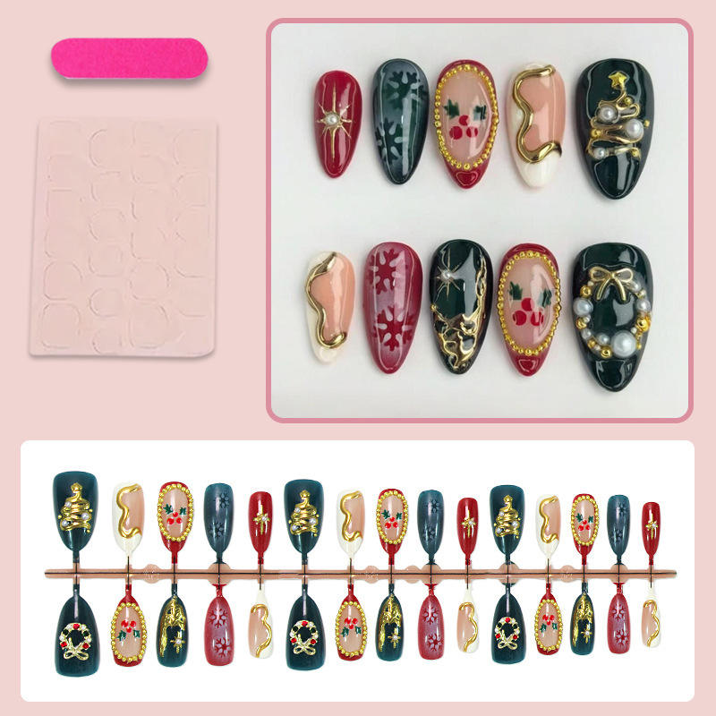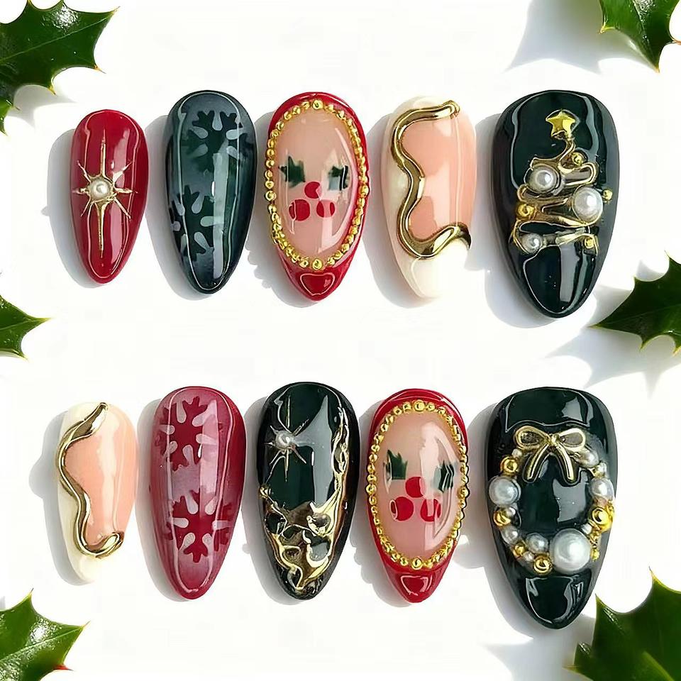 Uñas Postizas Hechas a Mano, Color Sólido Almendrado, con Electroplacado, Piezas de Uñas Artísticas, Uñas Postizas Desmontables, Manicura Navideña