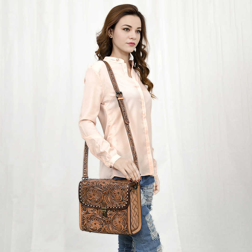 Bolso bandolera de cuero occidental hecho a mano, diseño tallado Floral Vintage, Correa única ligera para mujer, verano e invierno