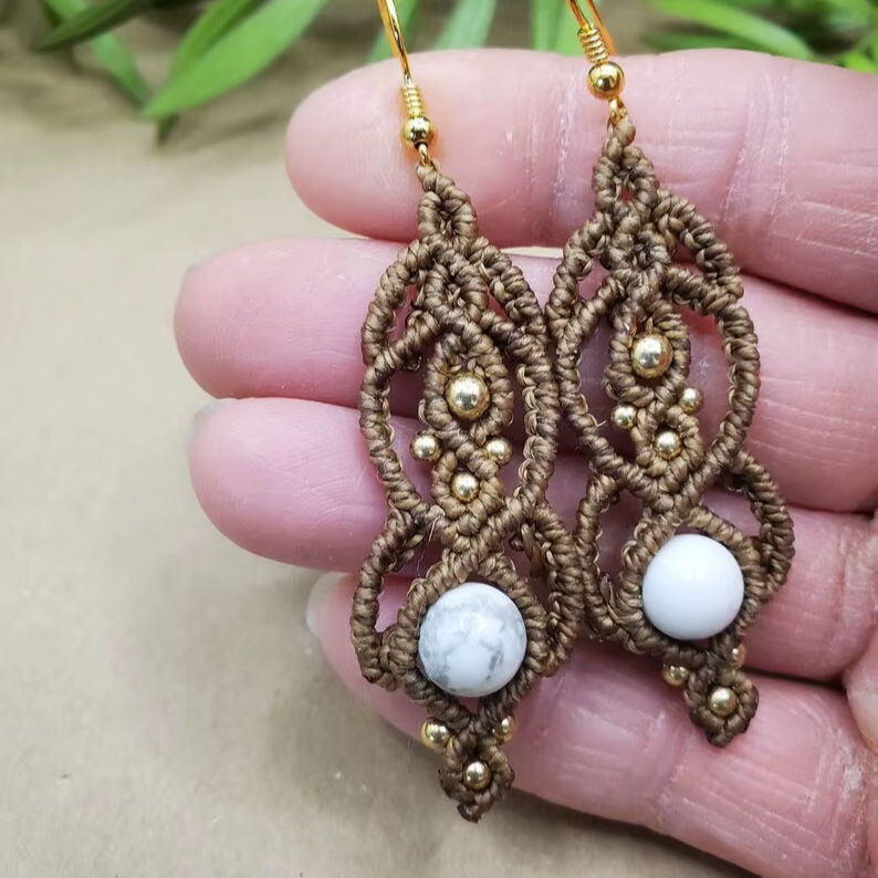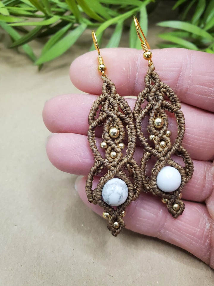 Pendientes Colgantes Hechos a Mano con Howlite Blanco en Forma de Bola, Cordón Marrón, Estilo Bohemio, con Cuentas Doradas, Joyería Artesanal, Regalo para Mujer