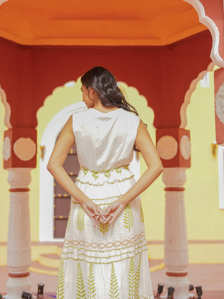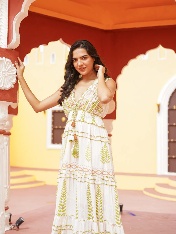 Vestido Largo de Verano Bohemio de Encaje Blanco Hecho a Mano con Bordado Floral, Vestido de Algodón Indio Fluido para Playa o Resort