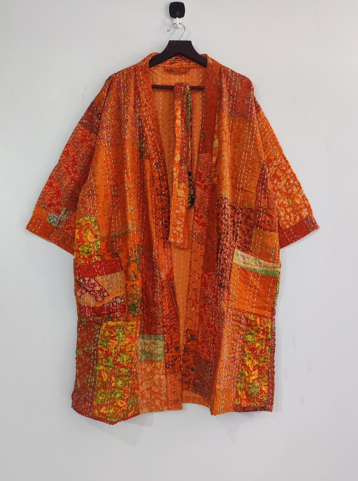 Kimono Kantha de seda de algodón hecho a mano para mujer, hermosos patrones intrincados, bolsillos de doble capa, envío gratis Natural