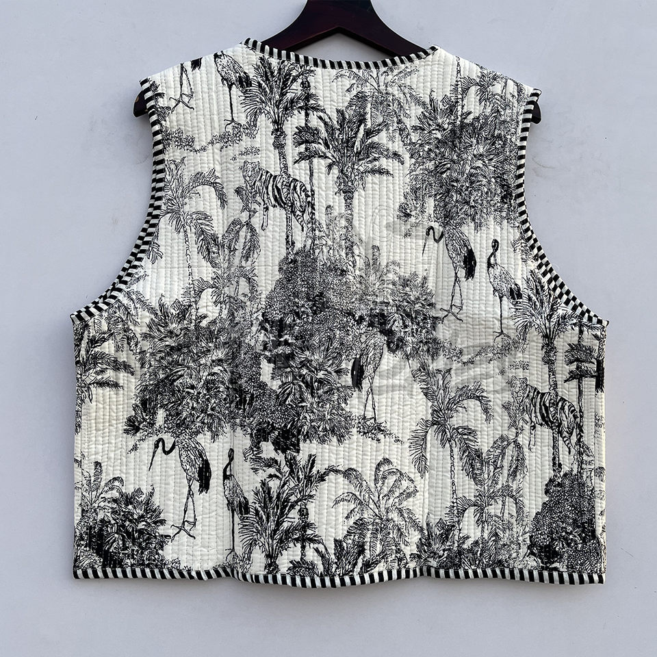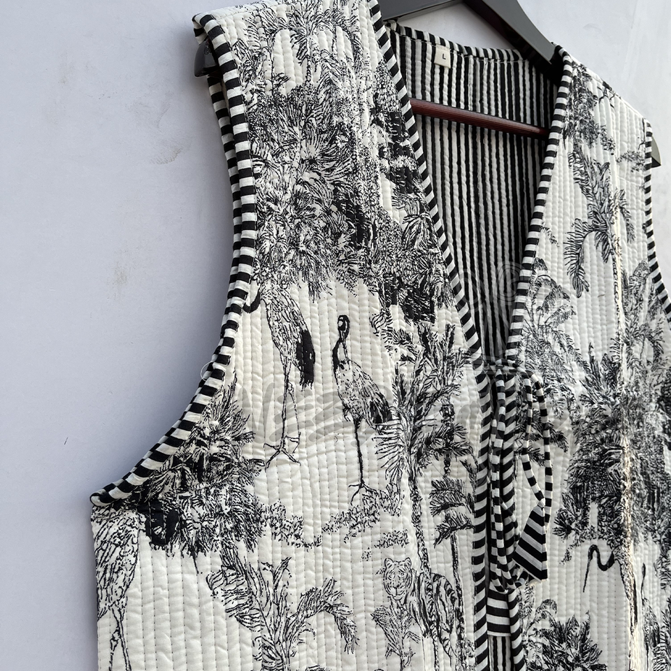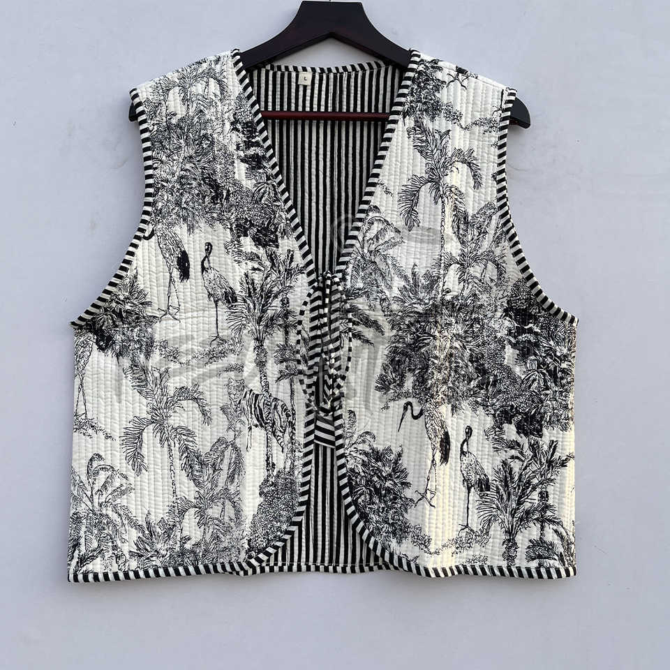 Chaleco bomber de punto floral sin mangas hecho a mano para mujer, chaleco abierto frontal, relleno de algodón sostenible, estampado a mano