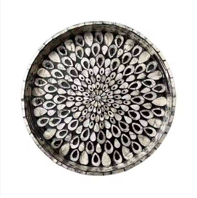 Placa de madera hecha a mano con incrustaciones de perlas Madre, bandeja de cargador de servicio decorativa, acabado pulido Royal India
